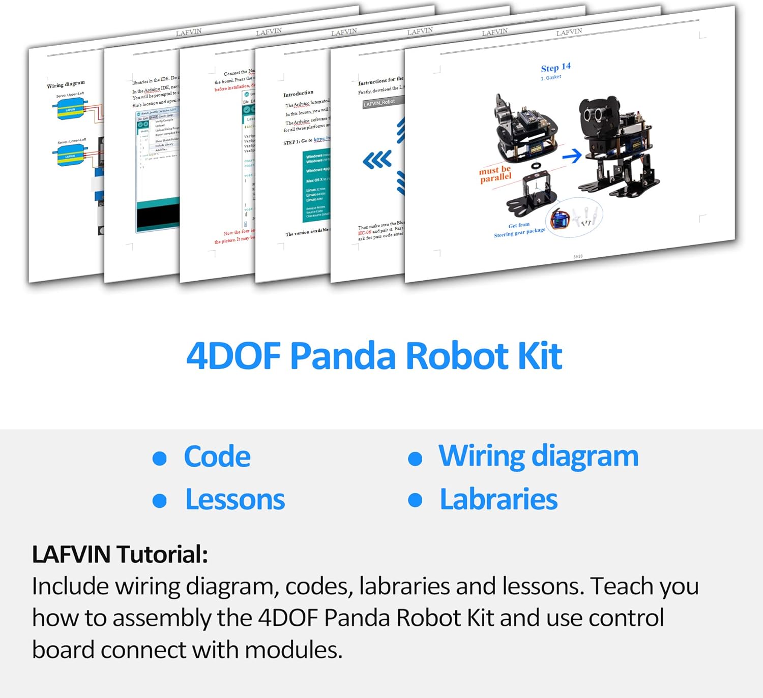 I ordered this kit twice (got another sent for returning first one), but both kits missing same parts, although kits were sealed and not damaged.Good price on a kit that includes a pretty good assortment of both electronic components and hardware to build the robot, BUT, it is missing the parts that make up the legs and to attach the servo motors to the feet, so you are unable to complete the build.You do get an Arduino Nano, a nano expansion board, a bluetooth module, 4 servo motors, an ultrasonic sensor, and a battery box with cable to connect to expansion board. You also get all the screws and standoffs to connect the parts together. If you add up the price of this components purchase separately, it may exceed the cost of the kit alone!There are no instructions, but the Lafvin website has excellent documentation on both the build and programming of the Panda Robot, so sorry I did not get complete kit!So, if you order, please check kit for completeness before starting the build. I have included an image with missing parts enclosed in a bold red border.Really wanted to build this for my nephew!