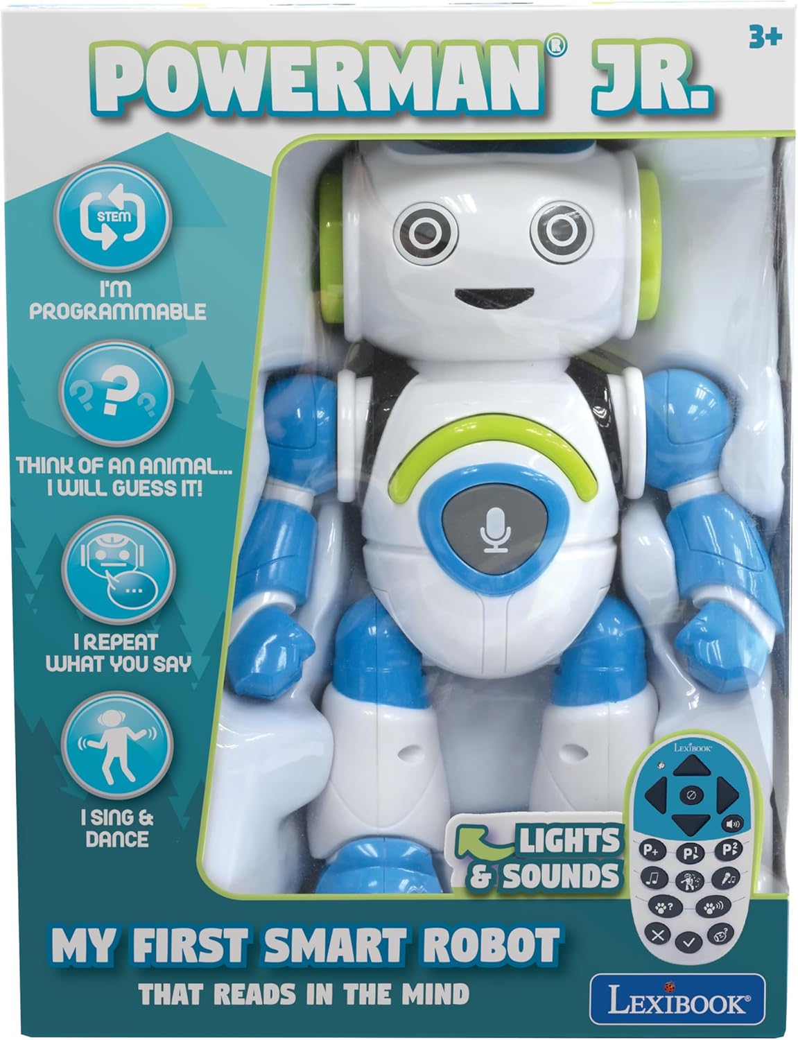 Your new friend – A speaking explorer robot that dances, plays music, reproduce animal sounds and more! With tons of surprises, sounds and light effects, its a great and lovable gift for kids aged 3+. He guesses animals – Contains an incredible animal guessing mode: The kid thinks of an animal, Powerman JR. will ask a few questions to be answered with Yes/No/I don’t know, and he will try to guess it! Unicorn, llama, cat, dog, sloth….a real challenge to find an animal he doesn’t know yet! Programmable – Program up to 40 actions with the ability to add music to create your own dances and choreographies he will memorize! He repeats after you – With the playback and recording function, he can repeat what you say with its funny robot voice. Includes a karaoke feature, where he will repeat in music! He will also reuse later what is taught to him. With remote control – Control him forward, backward, to the right and left, he can go in any directions! Power supply: 3x LR6/AA batteries for robot (not included) + 2x LR6/AA batteries for remote (not included). Includes: 1 robot + 1 infrared remote + 1 user manual + 1 Explorer’s Guide to learn more about our planet and its biodiversity! Also exists in pink (Powergirl Junior – ROB20GEN).