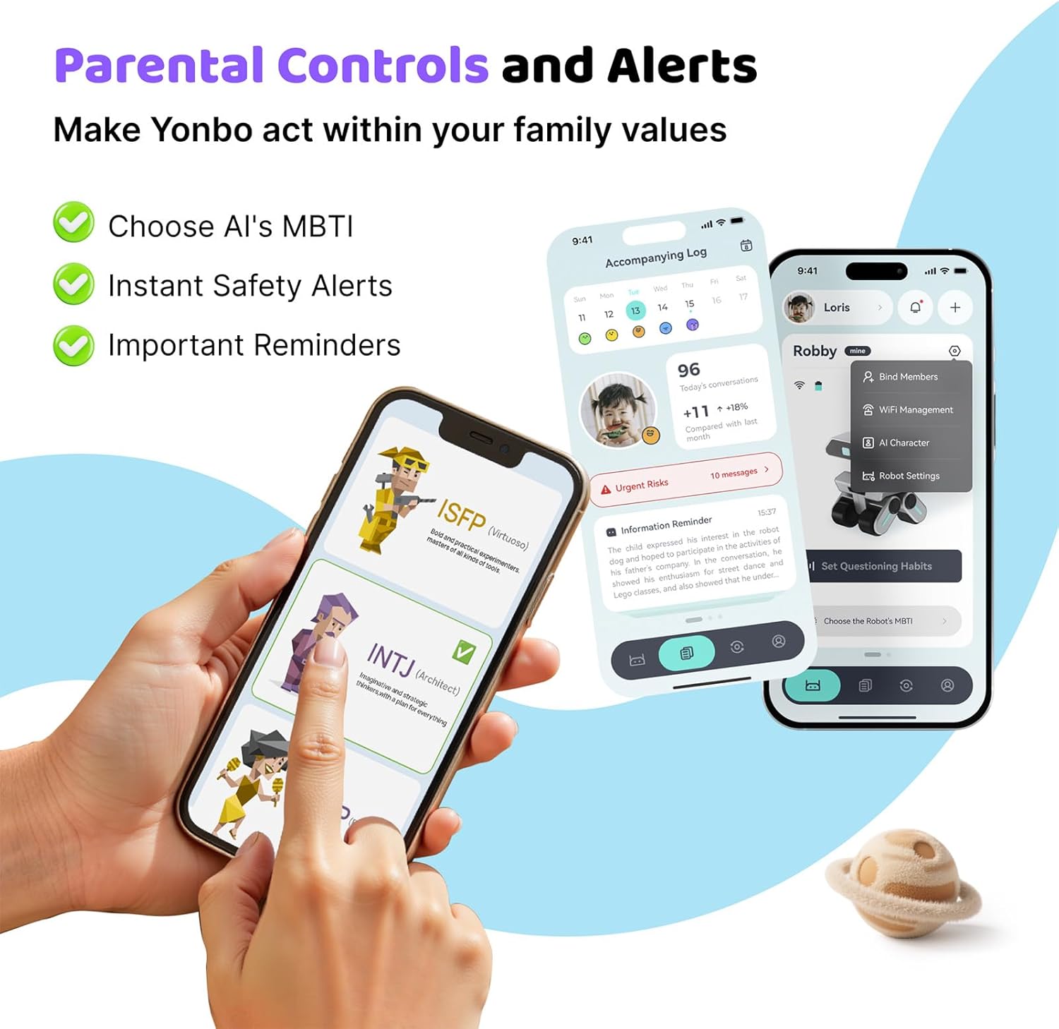 Total Parental Control, Peace of Mind: With Yonbo app, parents can fully define chatgpt robot’s personality traits, values (MBTI), behavioral rules and monitor emotional trends, interactive remotely and receive safety reminders. Yonbo respects your parenting style while supporting kid’s independence. Whether you’re single parents or busy professionals, Yonbo intelligent robot becomes your helpful extension—ensuring a safe, fulfilling parenting environment without replacing real human connection.